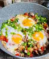 завтрак - Яичница-глазунья с хоровац-салатом и шашлыком<.Источник: Кулина.ру