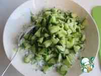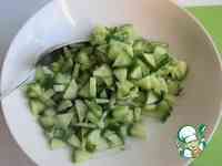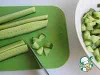 Длинный салатный огурец (200 г) хорошо вымыть, разрезать вдоль, а затем - на дольки.