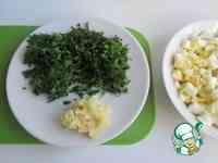 В это время очистить яйца от скорлупы и мелко их нарубить. Очистить чеснок и измельчить на мелкой тёрке, или через пресс.