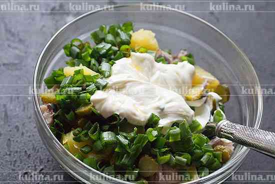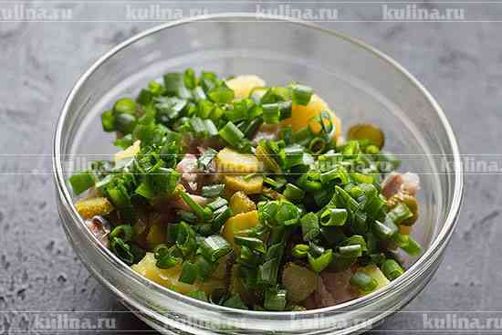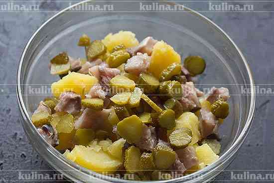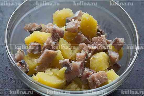 Селедку очистить от кожи и костей, нарезать кубиком и выложить к