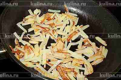 Шампиньоны нарезать соломкой и обжарить до готовности.