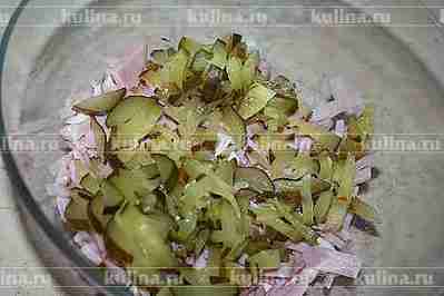 Огурец нарезать соломкой и добавить к остальным ингредиентам.