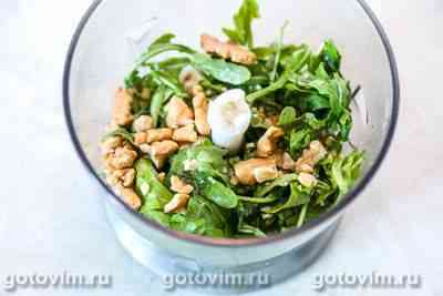 Очистить зубчик чеснока. В чашу блендера положить зубчик чеснока, рукколу и щепотку крупной соли. Слегка измельчить и добавить часть орехов.