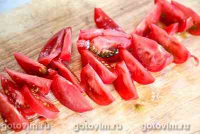 Помидоры вымыть и порезать дольками.