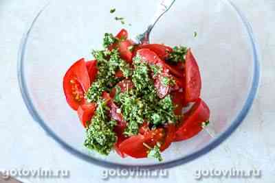 Соединить в салатнике дольки помидоров и соус из рукколы с орехами. Аккуратно перемешать. Готовый салат из помидоров с рукколой и