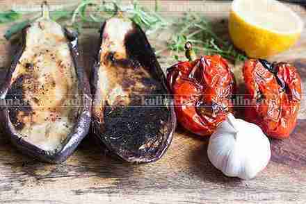 Заранее запеките баклажан и перец в духовке или в мангале. Очистите овощи от кожицы.