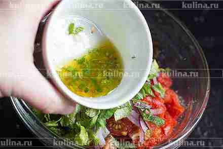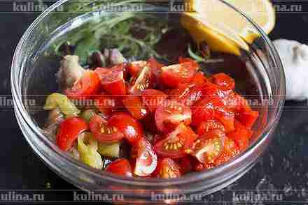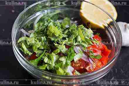 Выжать сок лимона. Чеснок мелко нарезать, положить в емкость.
