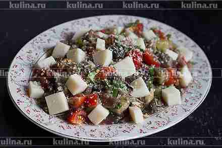 Сыр нарезать кубиками и положить на салат. Орехи натереть и посыпать салат. Подать салат к столу. Приятного аппетита!