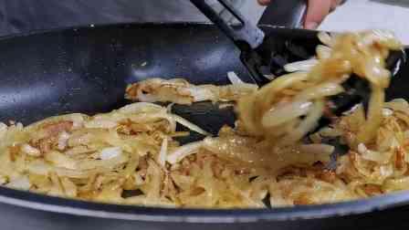 Следующий у нас лук и его довольно много. Режем лук полукольцами и обжариваем на растительном масле до выраженной румяности.