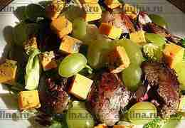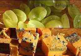 Виноград вымыть, обсушить, разрезать каждую ягодку пополам. Сыр нарезать небольшими кубиками.