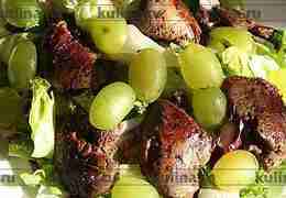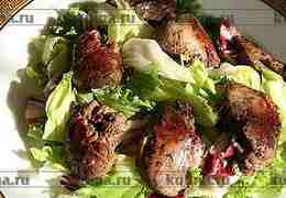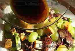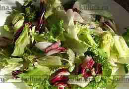 На большое блюдо выложить листья салата, полить немного заправкой.