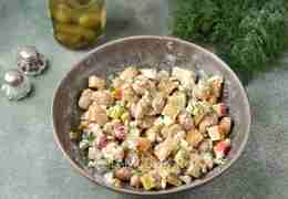 Такой салат спасает, когда «надо что-то быстро перекусить». Белая фасоль даёт мягкость, болгарский перец — свежесть, а сухарики — тот самый хруст, ради которого хочется съесть ещё ложку.