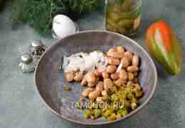 Фасоль промойте кипяченой водой, переложите в глубокую миску, добавьте мелко нарезанный сладкий лук и маринованные огурчики.