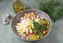 Салат чуть посолите и поперчите, всыпьте сухарики, заправьте вкусным нежирным майонезом, перемешайте тщательно салат.