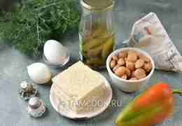 Для приготовления салата с фасолью, болгарским перцем и сухариками вам понадобятся все продукты на фото.