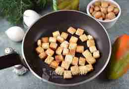 Нарежьте хлеб на мелкие кубики, подсушите на сухой сковороде до румяной корочки.