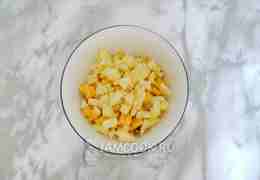 Яблоко помойте, очистите и тоже нарежьте кубиками.