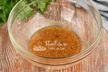 В глубокую миску добавляем сахар, соль, острую горчицу, сушеные травы (у меня орегано и базилик). Вливаем сок апельсина, растительное масло и соевый соус.