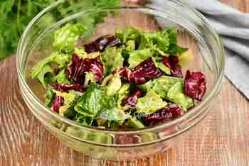 Выкладываем в заправку листья салата (у меня салатный микс) и перемешиваем.