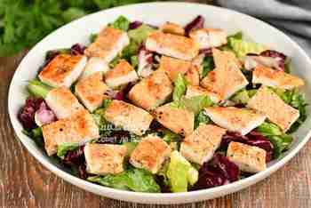 Перекладываем листья на большую тарелку с небольшими бортиками (в миске остается немного заправки). Филе нарезаем на средние кусочки и размещаем на листьях.