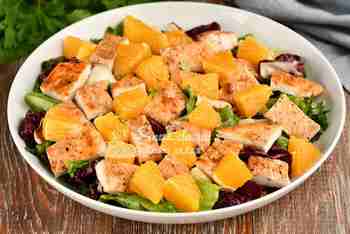 Дополняем салат сухариками и сразу подаем на стол. Сочные листья салата и апельсин, нежная курица, хрустящие сухарики, прекрасная сладковатая заправка — это очень-очень вкусно!Источник: Совет да Еда