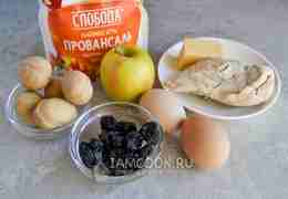 слои в следующем порядке: чернослив, яйца, яблоко, сыр. Каждый слой слегка уплотняйте и смазывайте майонезом.