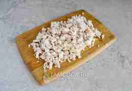 Куриную грудку нарежьте поперек волокон на мелкие кусочки.
