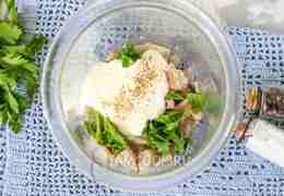 емкость луковую нарезку, нарезку зелени и сметану. Поперчите по вкусу. Соль добавлять не нужно - сельдь малосольная!