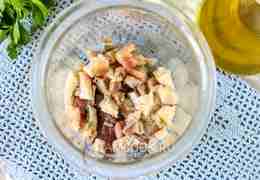 Нарежьте небольшими кусочками и выложите в глубокую емкость вместе с икрой или молоками.