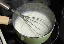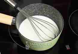 Венчиком смешивайте обжаренную муку со сливками, чтобы не было комков. Сливки лучше вливать не все сразу, а в два-три этапа.