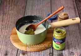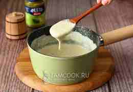 Загустевший соус снимите с огня, добавьте по вкусу соль и ложечку с горкой соуса песто (а можно и две).