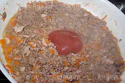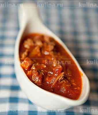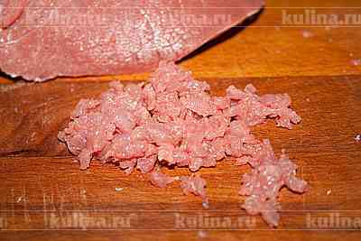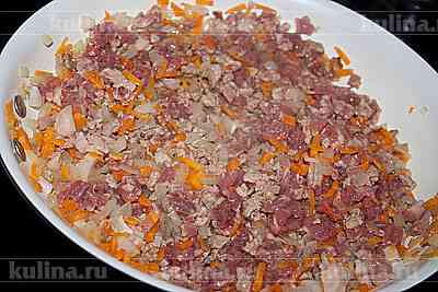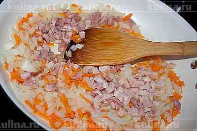 Грудинку нарезать мелким кубиком и добавить к овощам.