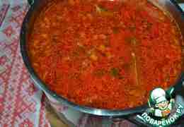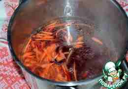 В бульон добавить морковь и свеклу (все соломкой), поставить на медленный огонь.