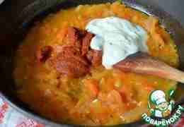 Затем добавить томатную пасту и сметану, да да, сметану в зажарку. Тушить на медленном огне, постоянно помешивая.