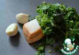 при подаче. Добавить картофель, через 10 минут нашинкованную капусту. Приготовить заправку. Измельчить зелень, чеснок и немного