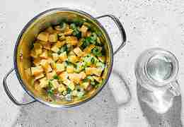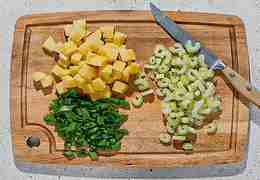 Нарежьте картофель кубиками, сельдерей нашинкуйте тонкими ломтиками, зеленый лук – тонкими колечками.