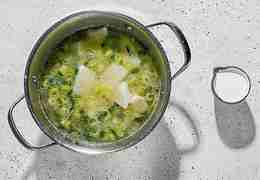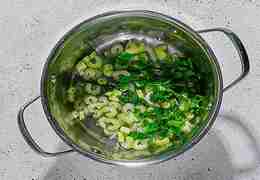 Разогрейте в кастрюле оливковое масло, пассеруйте сельдерей 5 мин, добавьте зеленый лук и готовьте еще 2–3 мин, помешивая.