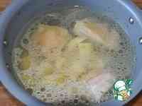 Берём бульон, у меня куриный. Мясо можете вытащить, но я предпочитаю варить суп вместе с мясом, чтобы у курицы был вкус овощей.