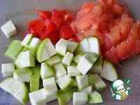 Режем кубиками кабачок (молодой), болгарский перец и помидоры.