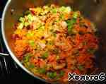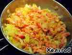 Обжаренные лук с беконом соединяем с морковью и сельдереем в большой кастрюле и добавим чайную ложку сахара.