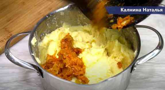 Картофель сливаем. Превращаем в пюре при помощи картофелемялки, добавляем примерно 30 грамм сливочного масла, 1 желток.