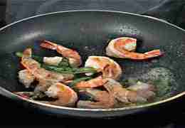 Разогреть в сковороде оставшееся масло и обжарить креветки и оставшиеся листики шалфея, часто