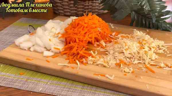 Теперь выкладываем на сковороду подготовленные овощи: лук, морковь и пастернак.