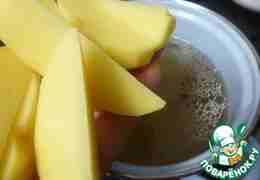 Куриное мясо вытащить. Бульон процедить и снова поставить на плиту. Картофель почистить и крупно нарезать, я разрезала вдоль на четыре