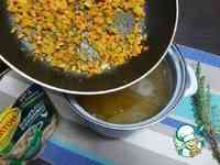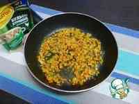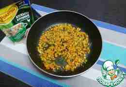 Мелко нарезать лук, морковь и сладкий перец. Добавить куркуму. Обжарить до мягкости.