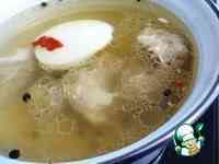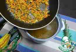 части. Отправить его в бульон. Положить листики тимьяна (оборвать с веточек) и сухой чеснок.