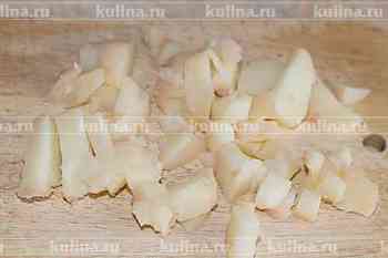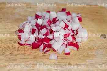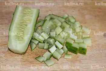 Огурцы при желании (мы этого не делали) очистить от кожицы и семян и нарезать кубиками.