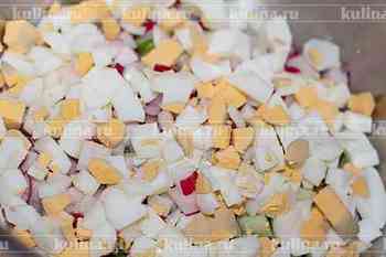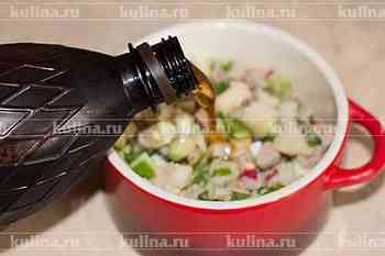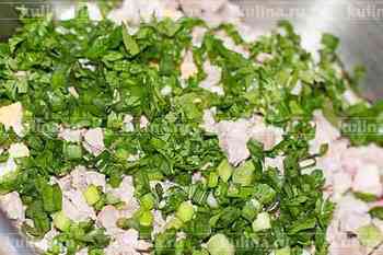 Соединить все в кастрюле или большой миске. Зелень мелко нарезать и добавить к