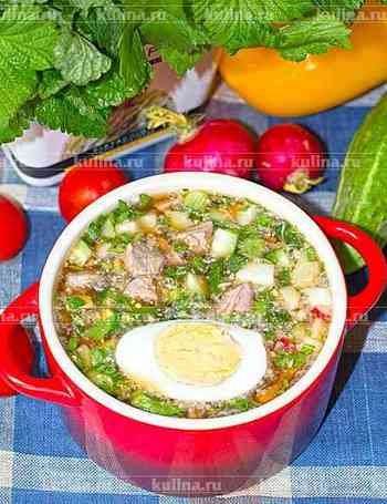 Разлить окрошку по тарелкам и подать к столу. Посолить по своему вкусу.