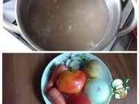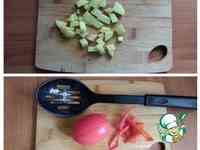 и опускаем в кипящий бульон. Через минуту вынимаем. Кожица легко снимется. Нарезаем помидор мелким кубиком.